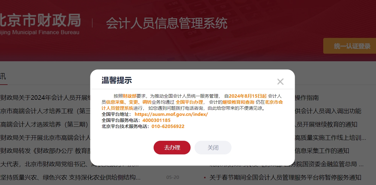 按照財(cái)政部要求,為推動(dòng)全國(guó)會(huì)計(jì)人員統(tǒng)一服務(wù)管理, 自2024年8月15日起 會(huì)計(jì)人員信息采集、變更、調(diào)轉(zhuǎn)業(yè)務(wù)均通過(guò) 全國(guó)平臺(tái)辦理, 會(huì)計(jì)的繼續(xù)教育和查詢(xún) 仍在北京市會(huì)計(jì)人員管理系統(tǒng)進(jìn)行, 如您遇到問(wèn)題撥打電話咨詢(xún),由此給您帶來(lái)的不便請(qǐng)見(jiàn)諒。