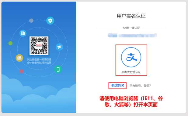 注冊成功后需要進(jìn)行本人支付寶實(shí)名認(rèn)證與微信綁定,點(diǎn)擊頁面中支付寶認(rèn)證圖標(biāo),手機(jī)打開本人支付寶(與注冊的證件號碼與姓名一致)掃描二維碼完成實(shí)名認(rèn)證,如下圖所示: