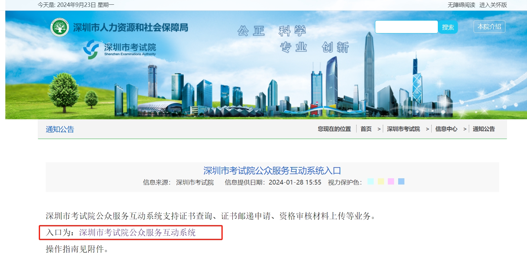 深圳市考試院公眾服務(wù)互動系統(tǒng)支持證書查詢、證書郵遞申請、資格審核材料上傳等業(yè)務(wù)。