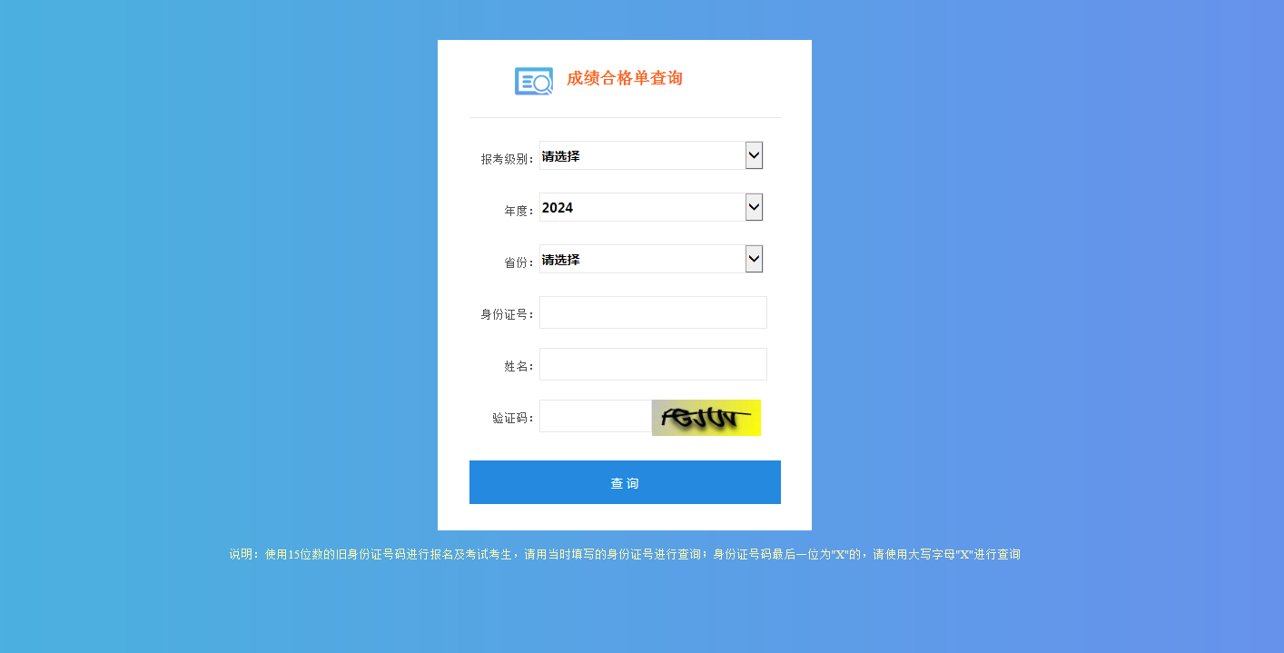 第四步:按要求分別輸入“報(bào)考級(jí)別”、“年度”、“省份”、“身份證號(hào)”、“姓名”和“驗(yàn)證碼”后,點(diǎn)擊“查詢”。