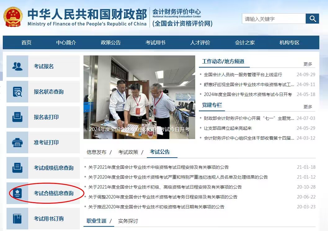 第三步:進(jìn)入“考試合格信息查詢”模塊中“全國(guó)會(huì)計(jì)專業(yè)技術(shù)資格考試合格信息查詢”界面,點(diǎn)擊“初級(jí)、中級(jí)”并進(jìn)入相關(guān)頁(yè)面。