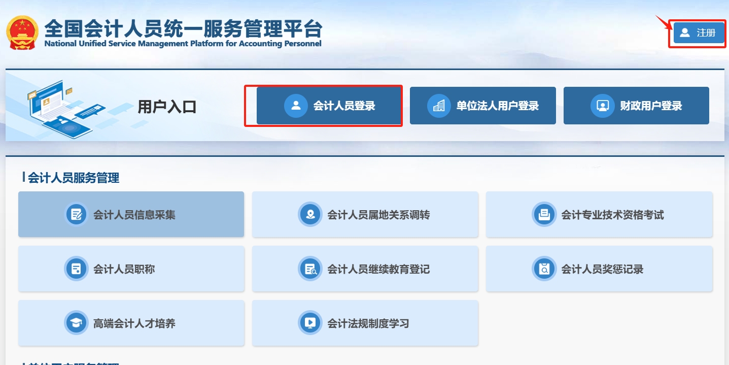 注冊成功后,登錄全國會計(jì)人員統(tǒng)一服務(wù)管理平臺首頁,點(diǎn)擊“會計(jì) 人員登錄 ”,輸入注冊時(shí)所填寫的證件號碼/手機(jī)號、密碼,輸入驗(yàn)證碼后點(diǎn)擊登錄。
