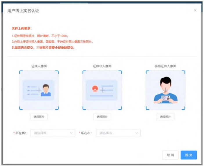 無法使用支付寶進(jìn)行實(shí)名認(rèn)證,可以在彈窗下方點(diǎn)擊線上實(shí)名認(rèn)證。線上實(shí)名認(rèn)證窗口需要上傳證件人像面、證件非人像面、手持證件人像面以及選擇所在省市。請仔細(xì)閱讀文件上傳要求,按要求上傳證件文件。