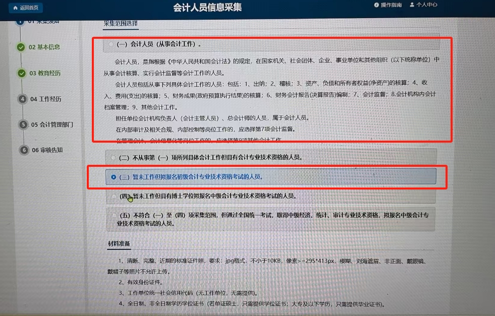 2025年初級會計(jì)資格考試報(bào)名前需登陸全國會計(jì)服務(wù)統(tǒng)一管理平臺進(jìn)行信息采集。已經(jīng)從事會計(jì)工作的人員,需要選會計(jì)人員身份進(jìn)行信息采集;尚未從事會計(jì)工作的人員,需要選擇擬報(bào)名初級會計(jì)專業(yè)技術(shù)資格考試,然后進(jìn)行信息采集。具體初級會計(jì)報(bào)名信息采集操作流程和方式如下: