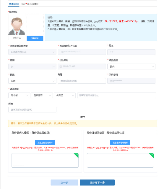 在基本信息頁中需上傳標(biāo)準(zhǔn)證件照片(照片要求:jpg 格式,不小于 10KB,像素>=295*413px,模糊、劉海遮眉、非正面、戴眼鏡、戴帽子等照片不允許上傳)。其中,基本信息中有效身份證件類型、有效身份證件號碼、姓名、性別、出生年月以及手機(jī)號碼將自動讀取注冊時(shí)所填的信息。附件上傳請根據(jù)所填寫的證件類型上傳身份證明人像面、身份證明國徽面 (附件要求:上傳 jpg、、png 圖片文件,大于 20KB 且不超過 500KB)。完成基本信息填寫后點(diǎn)擊“保存并下一步 ”進(jìn)入到教育經(jīng)歷頁面。提示:非本地戶籍暫未工作且不屬于在校學(xué)生的人員,上傳本地居住證。居住證和身份證合并到一張圖片。