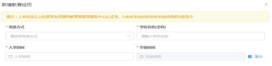 在教育經(jīng)歷頁中,點(diǎn)擊新增進(jìn)行教育經(jīng)歷的信息采集。新增教育經(jīng)歷 彈窗包括培養(yǎng)方式、學(xué)校名稱、學(xué)歷、學(xué)位(填寫已取得證書的學(xué)歷、學(xué)位)、所學(xué)專業(yè)、入學(xué)時(shí)間、畢業(yè)時(shí)間、學(xué)歷證書編號、學(xué)位證書編號。