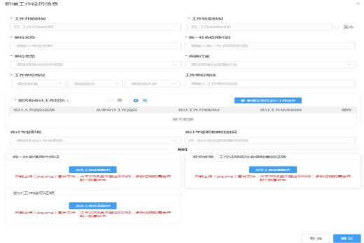 在工作經(jīng)歷頁中點(diǎn)擊新增進(jìn)行工作經(jīng)歷的信息采集。選擇工作開始時(shí) 間和工作結(jié)束時(shí)間,工作結(jié)束時(shí)間可以選擇至今。在填寫完單位名稱、統(tǒng) 一社會信用代碼、單位類型、所屬行業(yè)、工作單位地址、工作單位電話后 選擇是否有會計(jì)工作經(jīng)歷。若選擇是,需要新增會計(jì)專業(yè)工作經(jīng)歷。