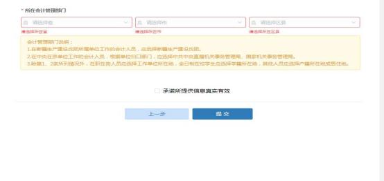 選擇會計(jì)管理部門后,勾選“承諾所提供信息真實(shí)有效 ”后提交審核。
