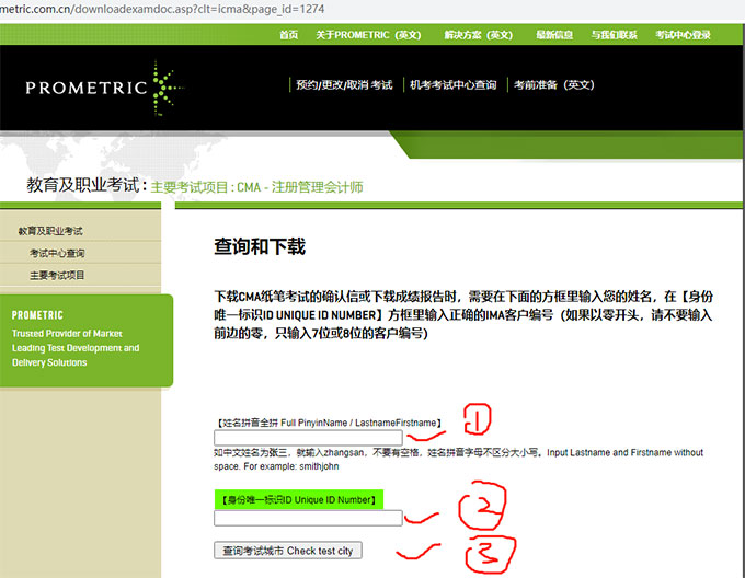 中文考試的具體考試地址要在考前10天左右去普爾文中文網(wǎng)站下載準(zhǔn)考信。下載鏈接:http://www.prometric.com.cn/downloadexamdoc.asp?clt=icma&page_id=1274,或者點(diǎn)擊下方圖片進(jìn)入。