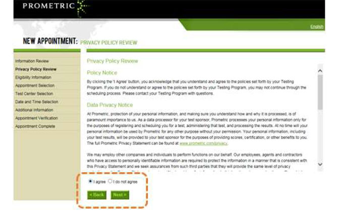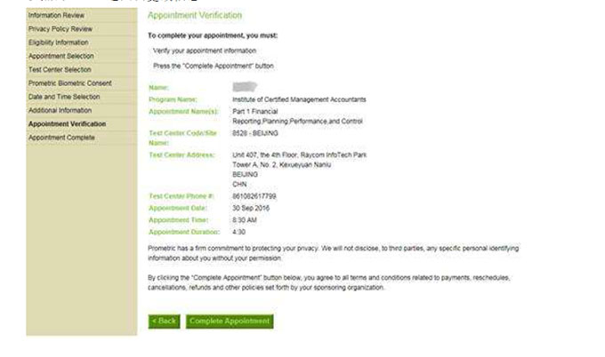 第十二步、核對信息界面, 核對姓名,考試科目,考場地址,考試時間是否正確?確認無誤后,點擊”CompleteAppointment”完成預約。如果發(fā)現(xiàn)姓名或考試科目有誤,請暫停注冊,聯(lián)系考試廠商, 例如:ICMA 考生請聯(lián)系 IMA,修改授權信息,修改成功后再繼續(xù)注冊。如果是選錯考場或日期,可以點擊”Back”退回去更改信息.