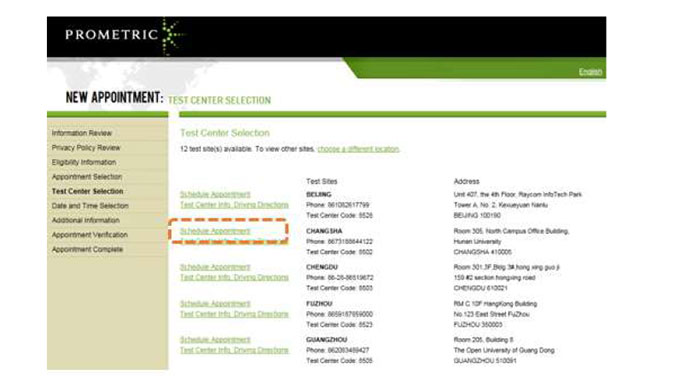第八步、進入考場列表界面, 請選擇具體的要預約的城市,(考場列表可以翻頁查看), 并點擊相應城市的“Schedule Appointment”繼續(xù)預約。