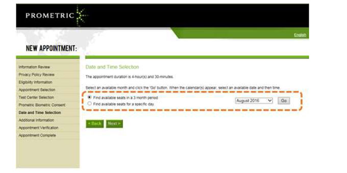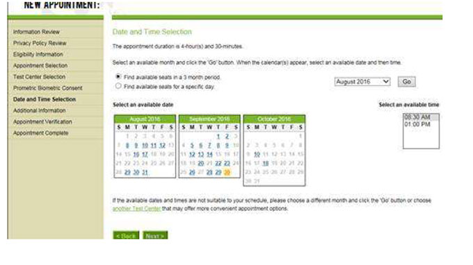 第九步、選擇考試日期界面, 根據(jù)考試時長和授權的有效期選擇 3 個月內的考場座位安排, 然后點擊”Go”,顯示預約的考場座位情況。