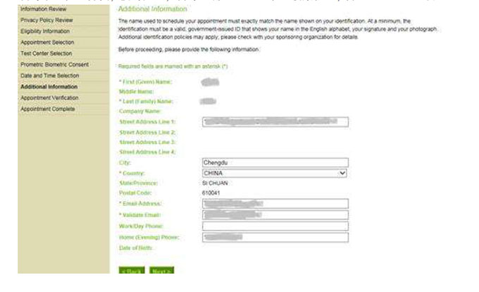 第十一步、填寫個人信息界面, 核對姓名, 填寫正確的地址及本人聯(lián)系信息, 并點擊”Next”繼續(xù)預約。