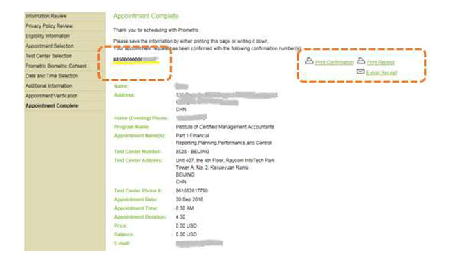 第十三步、確認界面, 預約完成會生成一個> 885 開頭的確認號碼, 請記錄此號碼用于參加考試,或者更改取消預約考試. 有些郵箱不能收到自動發(fā)送的確認信,并不會影響考生參加考試。但強烈建議考生手動點擊 email Receipt 或者 Print Receipt 保留確認號,或者截屏保存確認界面。ICMA 紙筆考試請在考前一周下載準考信 。