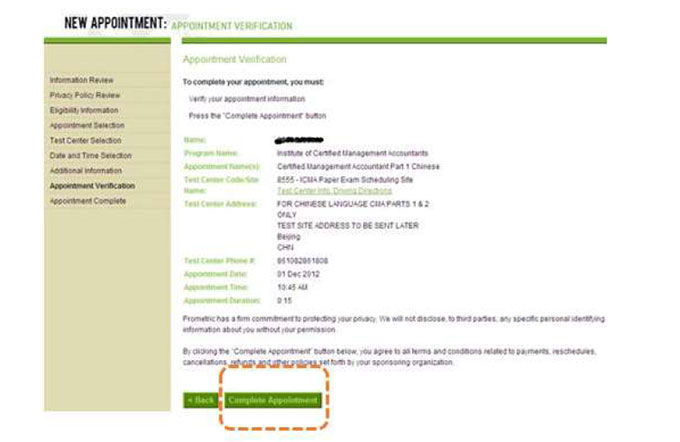 第五步、重新選擇考場(chǎng)和考試日期(參考《如何預(yù)約CMA考試?》這篇文章,擊此鏈接,) ,完成注冊(cè)預(yù)約信息,點(diǎn)擊“Complete Appointment”確認(rèn)預(yù)約。如果想取消CMA考試預(yù)約,請(qǐng)直接看第七步操縱。