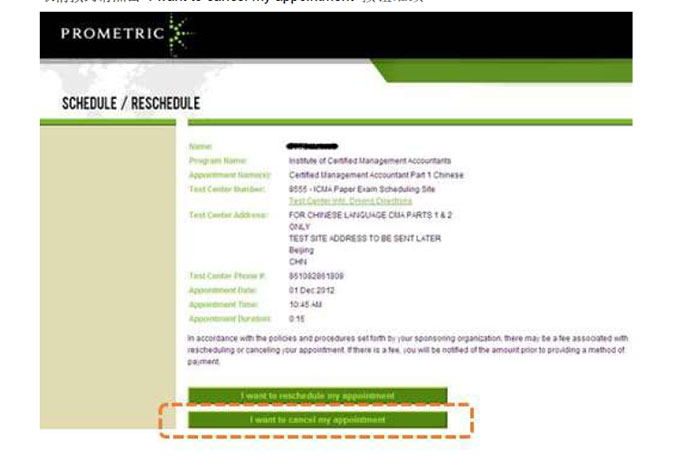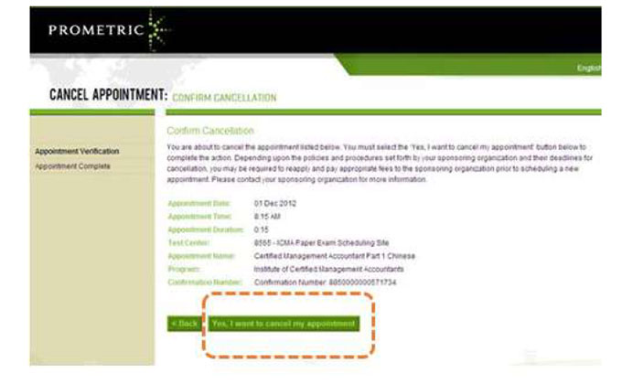 第八步、確認(rèn)取消考試,確認(rèn)前請(qǐng)聯(lián)系廠商確認(rèn)考試費(fèi)的政策,然后點(diǎn)擊“Yes,I want to cancel my appointment”確認(rèn)取消。