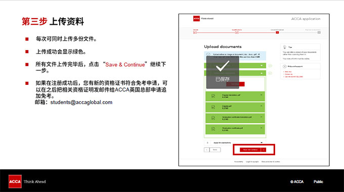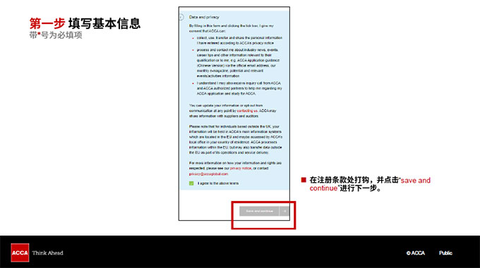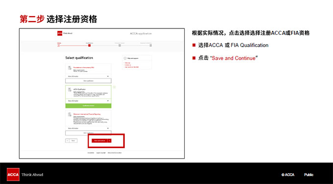 第二步、選擇注冊資格,根據(jù)實際情況選擇注冊ACCA或FIA資格,然后點擊 Save and Continue 按鈕