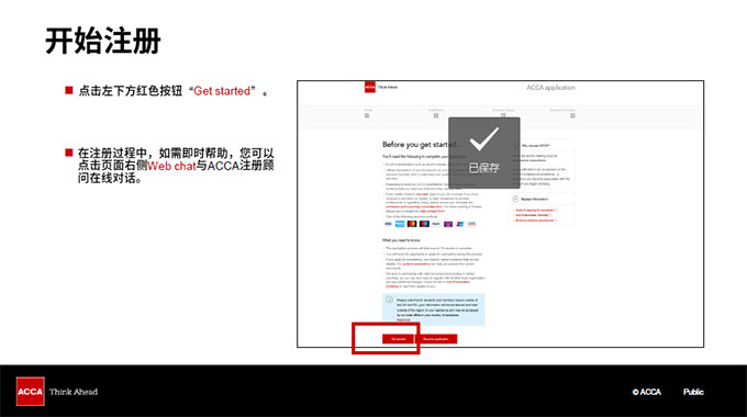 接下來,就開始我們的注冊之旅吧,點擊左下方紅色按鈕“Get Started”。在注冊過程中,如需幫助,可以點擊頁面右側(cè)Webchat與ACCA注冊顧問在線對話。