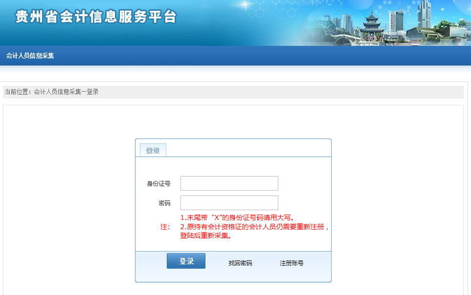 貴州信息采集由會計人員登錄“貴州財政會計網”(http://42.123.101.56:7001)自行網上填報(或修改)并上傳相關資料。