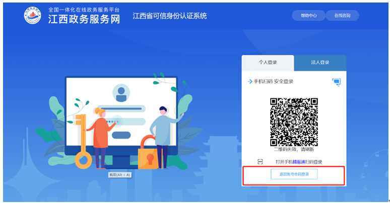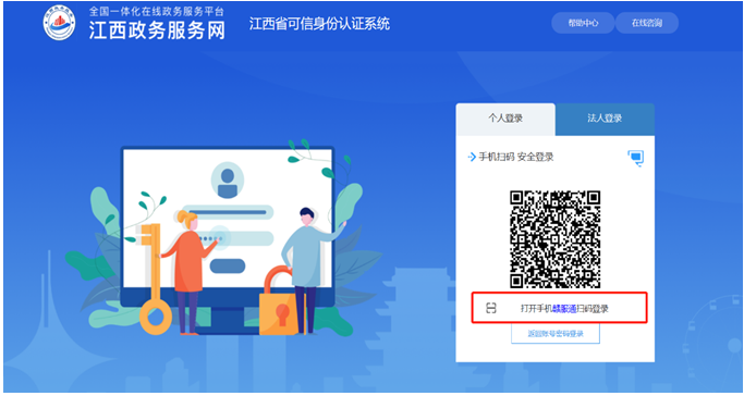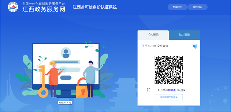 方式一:點(diǎn)擊“登錄”或“注冊”后進(jìn)入江西省可信身份認(rèn)證系統(tǒng)界面,桌面顯示登錄二維碼,用手機(jī)贛服通掃碼登錄