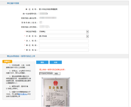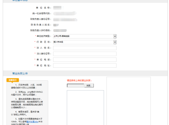 進(jìn)入登錄頁(yè)單位財(cái)務(wù)人員登錄系統(tǒng),填報(bào)單位基本信息,上傳對(duì)應(yīng)的營(yíng)業(yè)執(zhí)照證件照片,照片保證清晰、完整,大小不超過(guò)10Mb;格式支持png、jpg