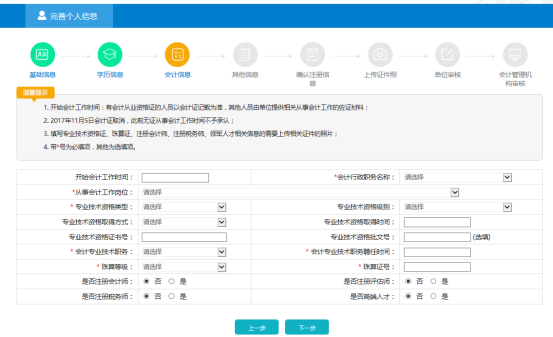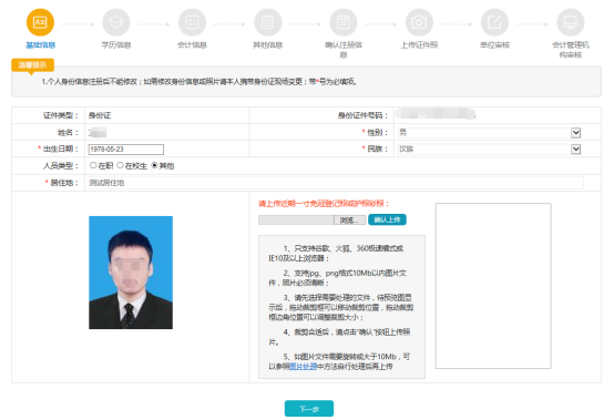 1.會(huì)計(jì)人員在填寫(xiě)個(gè)人基本信息過(guò)程中,同時(shí)在網(wǎng)上提交上傳本人的相關(guān)資料掃描件或照片,主要包括: