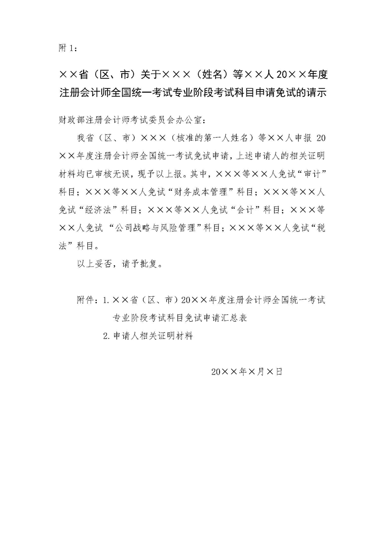 1.××省關(guān)于注冊會計師全國統(tǒng)一考試專業(yè)階段考試科目申請免試的請示(式樣)