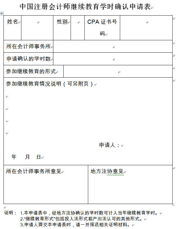 中國(guó)注冊(cè)會(huì)計(jì)師繼續(xù)教育學(xué)時(shí)確認(rèn)申請(qǐng)表