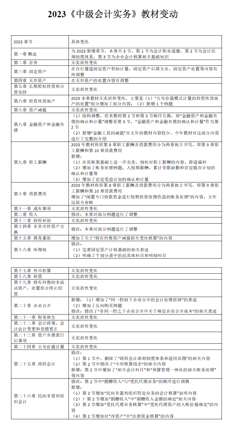 2023年中級會(huì)計(jì)考試官方教材已經(jīng)發(fā)行,今年新教材又有新變化,除《中級會(huì)計(jì)實(shí)務(wù)》官方教材變化較大外,其余兩科總體變動(dòng)不是很大,中級會(huì)計(jì)職稱教材各科目具體變化如下: