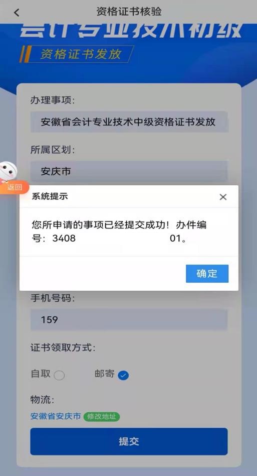 第四步:證書領(lǐng)取可選擇郵寄或自取兩種方式,如果選擇郵寄則需填寫物流地址(若收件人與考生姓名不一致,請?jiān)谔顚懙刂窌r(shí)備注考生姓名),工作人員會將證書郵寄到填寫的地址;如果選擇自取則會顯示自取地址,需自行前往該地點(diǎn)領(lǐng)取證書。選擇完畢后點(diǎn)擊提交會收到辦件編碼,可在“我的”-“我的辦件”中查看辦件進(jìn)度。
