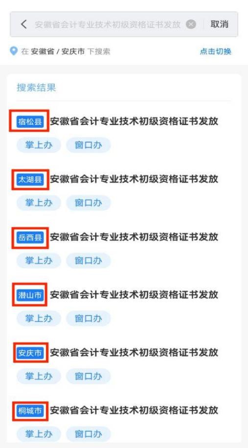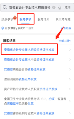 第二步:通過頂部搜索欄搜索“安徽省會計(jì)專業(yè)技術(shù)中級資格證書發(fā)放”,然后點(diǎn)擊考試時(shí)所在區(qū)劃的“掌上辦”進(jìn)入辦理。