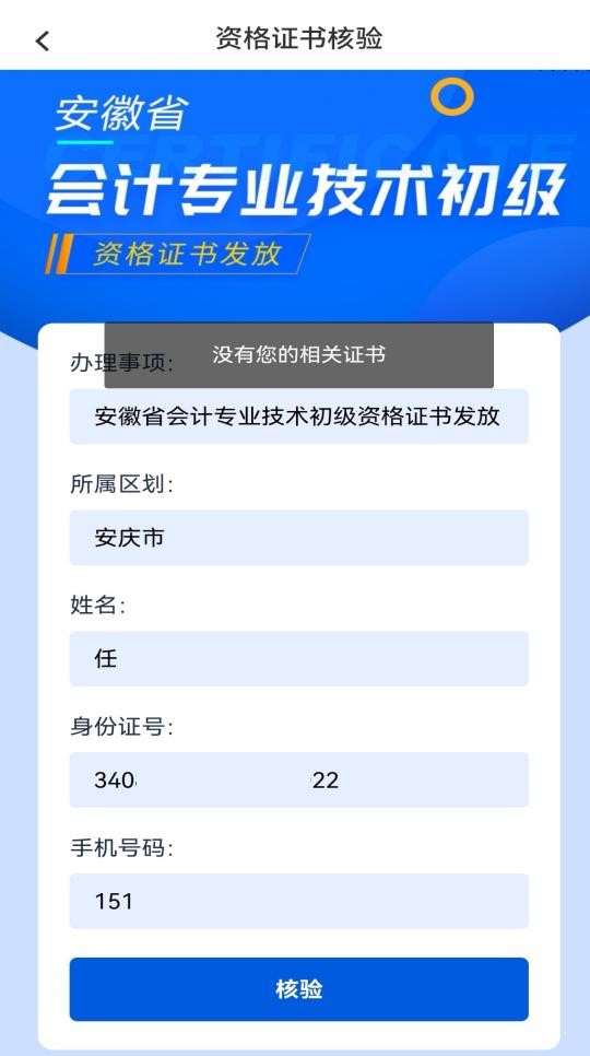 第三步:點(diǎn)擊辦理后進(jìn)入信息填報(bào)頁面,系統(tǒng)會自動導(dǎo)出所用賬號的各項(xiàng)信息,點(diǎn)擊核驗(yàn)后若有無證書則會顯示“沒有您的相關(guān)證書”,若有相關(guān)證書便可選擇證書領(lǐng)取方式。
