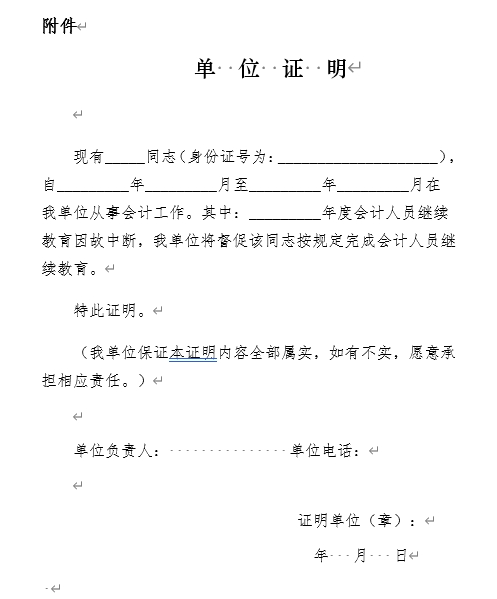 中級資格考試報考人員在全國會計人員統(tǒng)一服務管理平臺中的相關(guān)信息(包括歷年會計人員繼續(xù)教育信息)是判斷其會計工作年限的參考依據(jù)。報考人員因客觀原因造成個別年限繼續(xù)教育中斷的,需提供并上傳單位蓋章的證明(模板附后)。報考人員如需查詢原江蘇省會計人員信息采集系統(tǒng)中的繼續(xù)教育記錄,可登錄連云港市財政局官網(wǎng)會計之家欄目查看繼續(xù)教育查詢路徑的提示通知。
