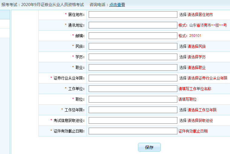 4.填寫考生姓名、證件類別、證件號(hào)碼、國(guó)籍、電子信箱、性別、出生日期、居住地市、通訊地址、郵編、民族、學(xué)歷、職業(yè)、證券行業(yè)從業(yè)年限、工作單位、職位、工作總年限等信息、(提示:標(biāo)記為*的部分為必填項(xiàng)。)