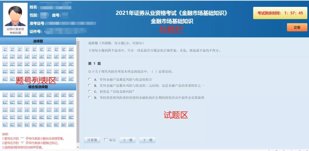 標(biāo)題欄中間位置為本場考試科目名稱,左側(cè)為考生基本信息,包括考生照片、姓名、性別、座位號(hào)、準(zhǔn)考證號(hào)和證件號(hào)碼。右側(cè)為本場考試科目剩余時(shí)間信息和“交卷”按鈕。