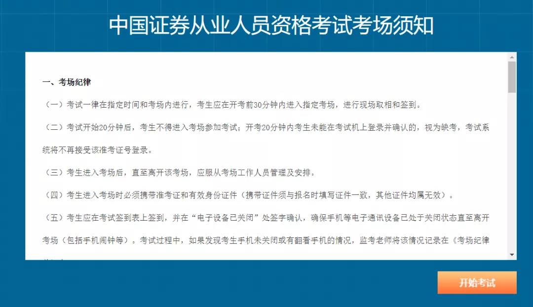提示界面包括:考場紀(jì)律、違紀(jì)處理、違紀(jì)申訴,點(diǎn)擊“開始考試”系統(tǒng)將自動(dòng)進(jìn)入考生答題界面。