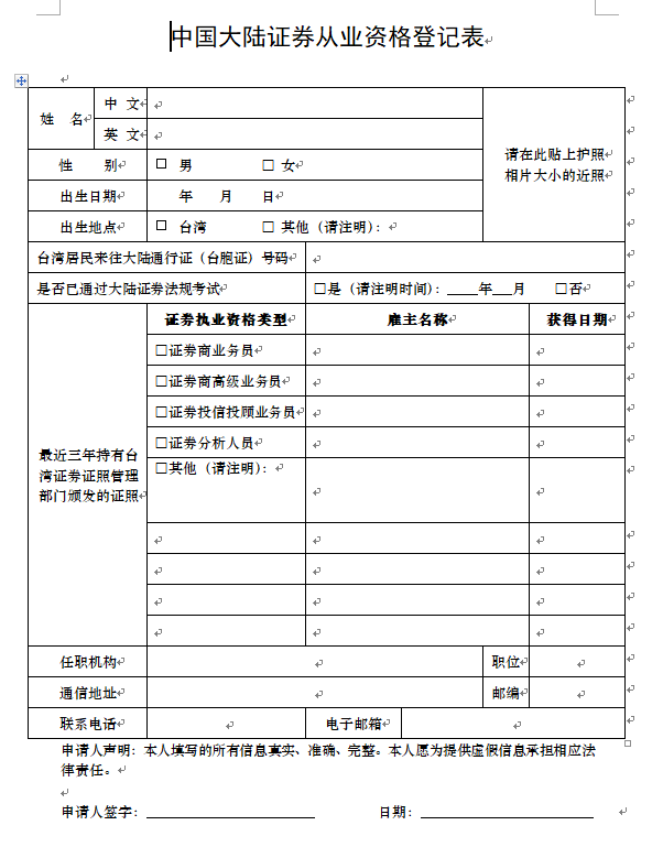 (四)《中國大陸證券從業(yè)資格登記表》。