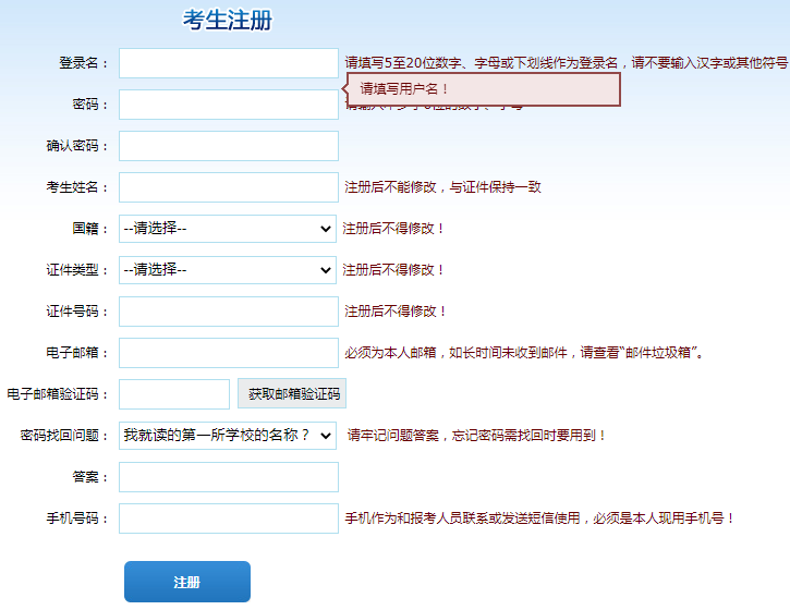 首次報名考生需進(jìn)行注冊并上傳符合要求的本人近期白色或藍(lán)色背景的證件照片,照片切勿進(jìn)行修圖處理,否則因照片比對無法通過將影響正常考試。已提交注冊照片的,如存在上述問題,應(yīng)及時進(jìn)行更換。