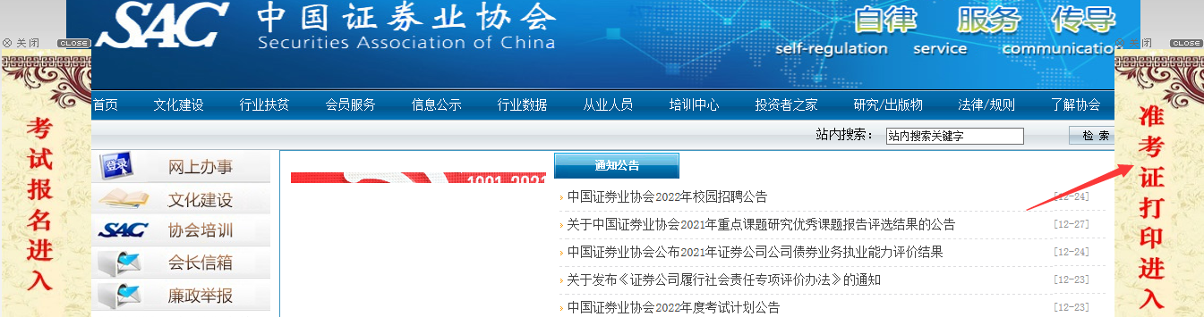報(bào)考成功的考生,可在規(guī)定時間內(nèi)登錄報(bào)名網(wǎng)站打印準(zhǔn)考證,打印網(wǎng)站:中國證券業(yè)協(xié)會。準(zhǔn)考證打印的唯一網(wǎng)址為協(xié)會官方網(wǎng)站,考生應(yīng)避免登錄其他網(wǎng)站進(jìn)行上述操作,以免泄漏個人信息。