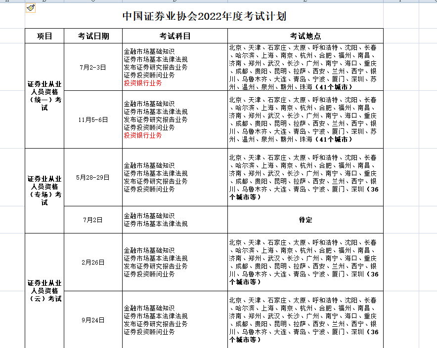 三、證券業(yè)從業(yè)人員資格(云)考試擬舉辦2次,面向證券公司報(bào)考,全國36個(gè)城市舉辦。